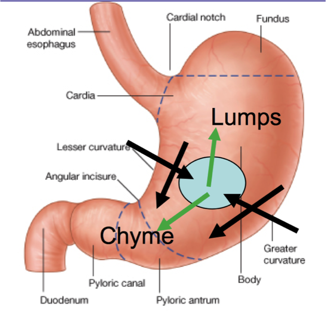 [*] The accelerating, rhythmic, peristaltic contraction moves solid lumps backwards into the fundus of the stomach while letting liquid chyme move forwards. As the chyme enters the pyloric region, a small squirt is ejected before the peristaltic wave reaches the pylorus and shuts it, so the rest of the chyme returns to the stomach.