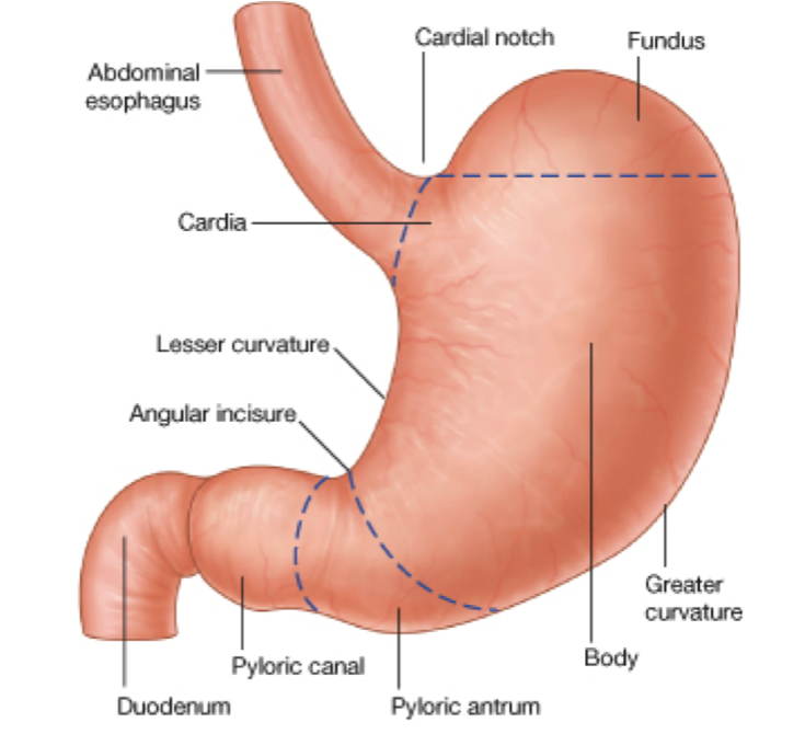 Describe the parts and curvatures of the stomach