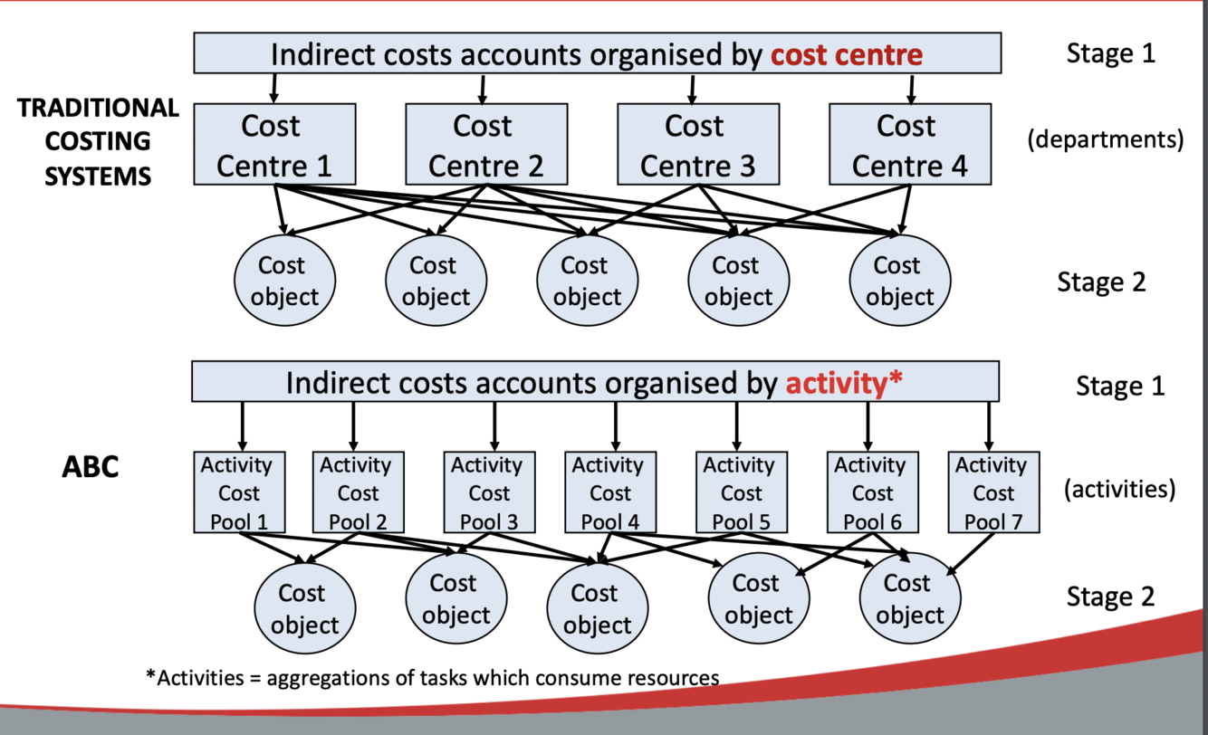 ABC methods expand the number of indirect cost pools (these are expressed in activities)that can be allocated to specific products. The traditional method takes one pool of a company’s total overhead costs to allocate universally to all products.