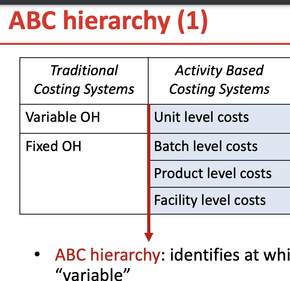 categorises costs based on the different levels of cost drivers. ABC uses a four-part cost hierarchy.