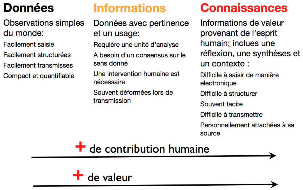 Savoir-faire et compétences acquis par une personne à travers des expériences ou son éducation. La connaissance est un bien intangible, donc limites de transmission.