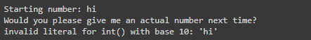 Python gives us a hint as to both the error (ValueError: invalid literal…) and the line of code in which the error occurred (in fact it gives us both the file and line number as well as the code from the line).