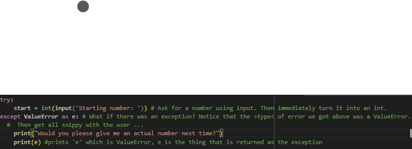 If a ValueError exception occurs (if the input is not a number), the except block handles it by printing a message and the exception itself (e is returned as the exception)