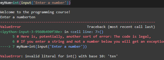 Running this code will produce an ValueError exeception as Python does not know what ‘ten’ is