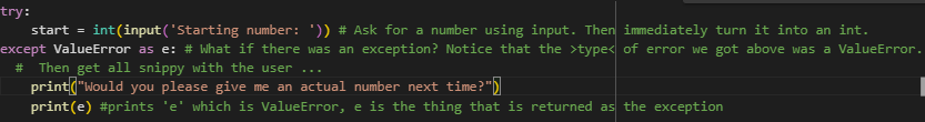 Instead, it executes the code in the except block, which typically includes a message and the error message itself (ValueError exception) and the programme stops but critically it does not crash.