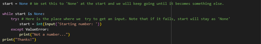 Since start is now updated with a valid integer, it is no longer None, and the loop exits at the bottom.”, printing “Thanks!”.