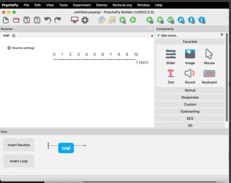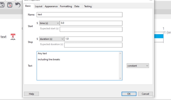 Start set to 0.0 meaning as soon as the routine ‘trial’ is run, the text will appear and last for 1.0s duration