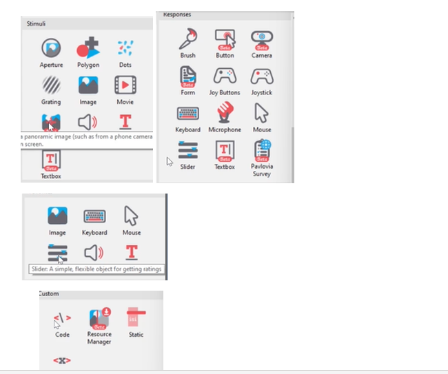 The things we can add to a routine e.g., a text, picture, key or mouse responses
