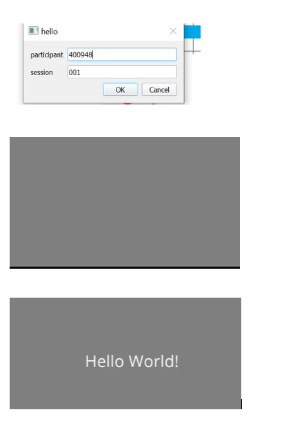 It will first pop up with box saying to input participant and session to help you keep track of participant and session, gives you a randomised participant ID - assumes running psychopy as part of experiment