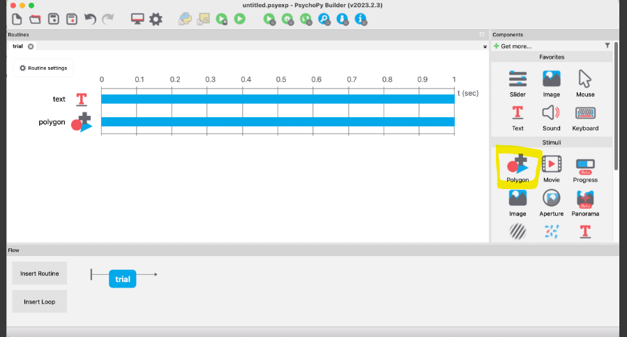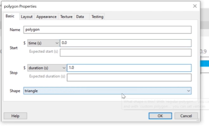 You can also add a a shape (polygon) in your experiment (alongside the ‘hello world’ text) in your trial routine by selecting ‘polygon’ from components: