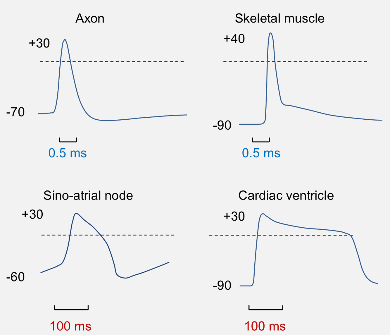 Draw and give th RMP for axons, skeletal muscle, SA node and cardiac ventricular muscle