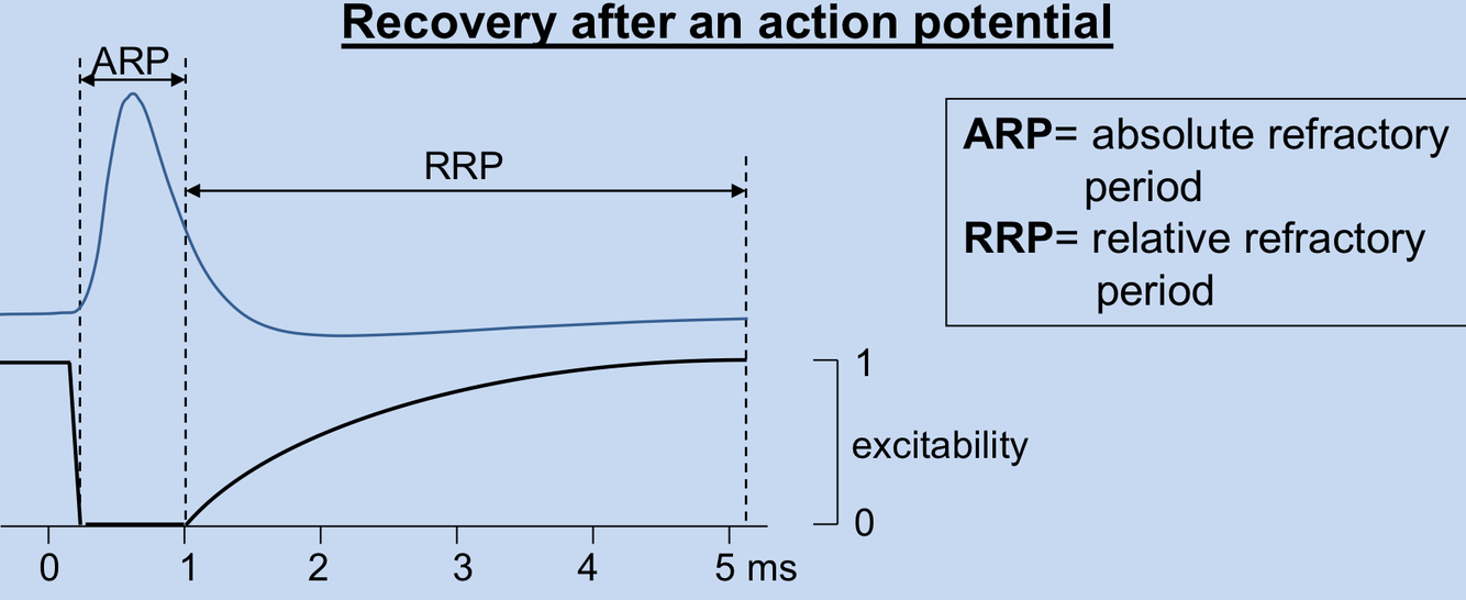 RRP - Na+ channels are recovering from inactivation, the excitability returns towards normal as the number of channels in the inactivated state decreases (maybe AP)
