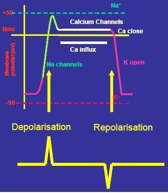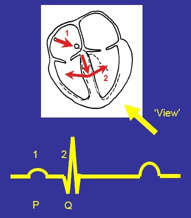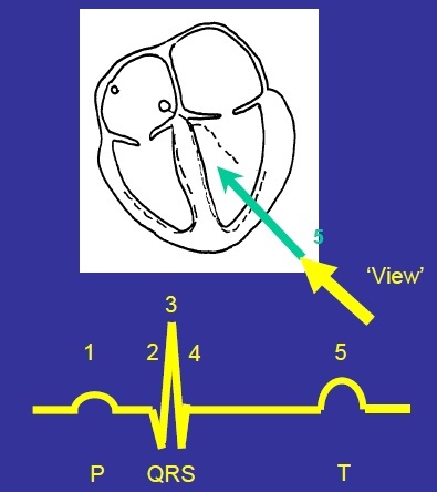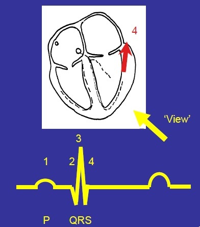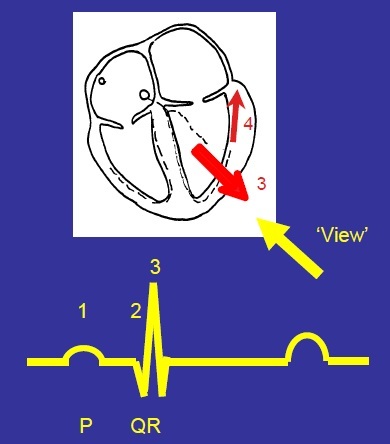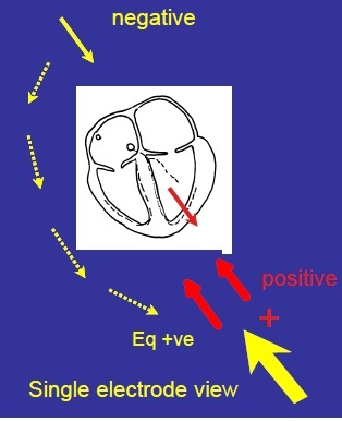 The electrodes on the skin therefore ‘see ‘ 2 signals with each systole: one on depolarisation (at the beginning of the AP) and one on repolarization (at the end of the AP).