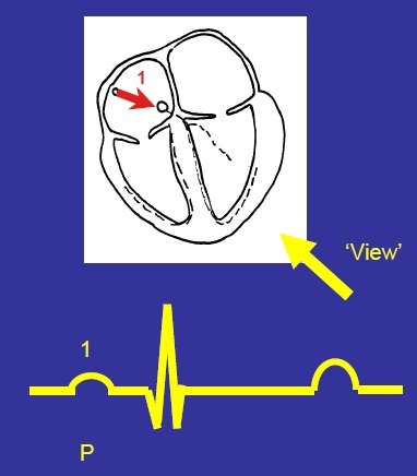 An action potential is generated by the pacemaker cells in the SAN (1) and electrical activity spreads over the surface of the heart to the AV node, where there is a delay of ~120ms (2).