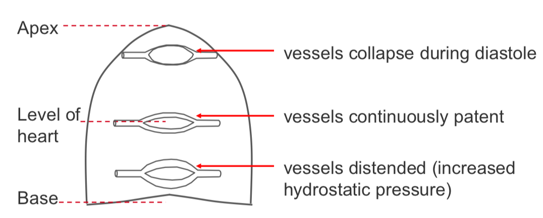 Gravity. In an upright position called orthostasis there is a hydrostatic pressure on vessels in the lower part of the lung.