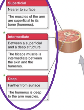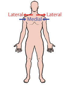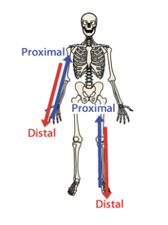 E.g. The elbow is proximal to the wrist but distal to the shoulder