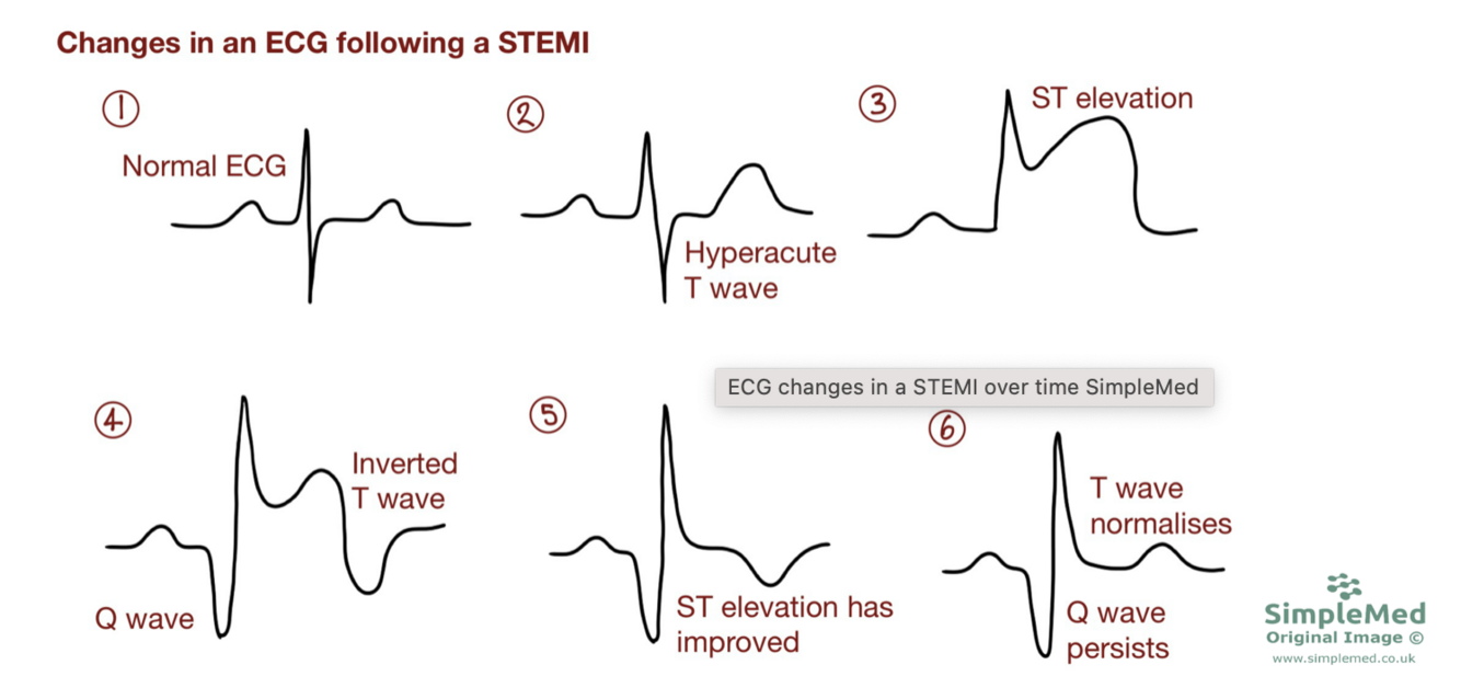 Describe the Evolution of waves in STEMI (LEARN AFTER ECG)