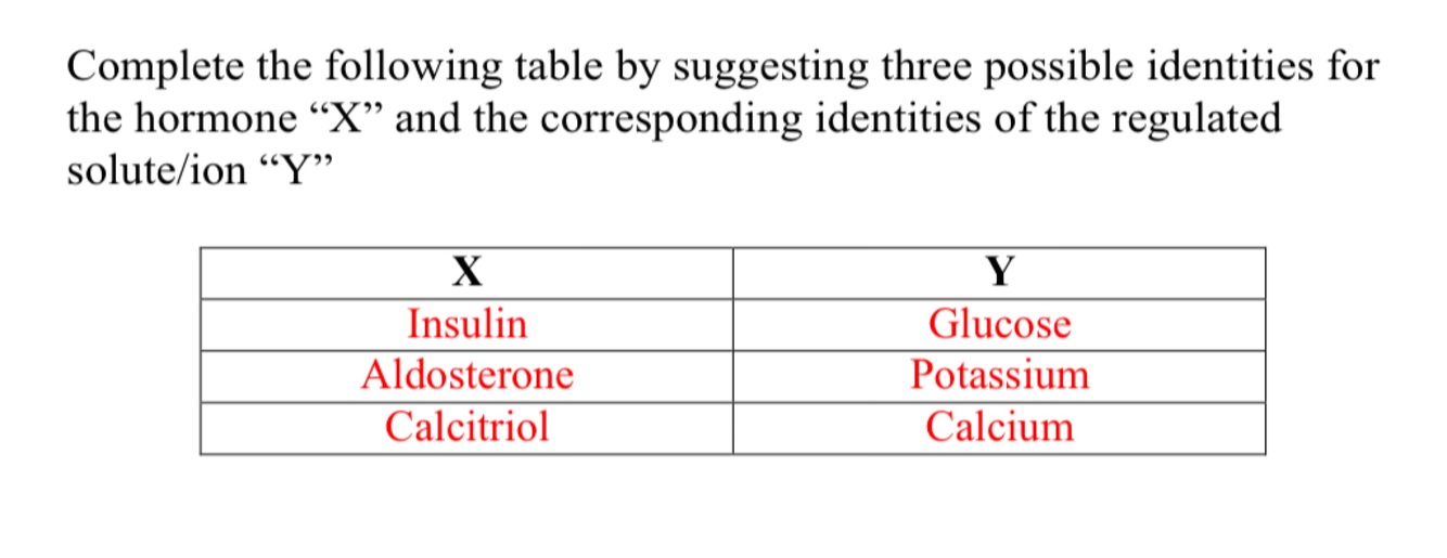 Complete the following table by suggesting three possible identities for the hormone “X” and the corresponding identities of the regulated solute/ion “Y”