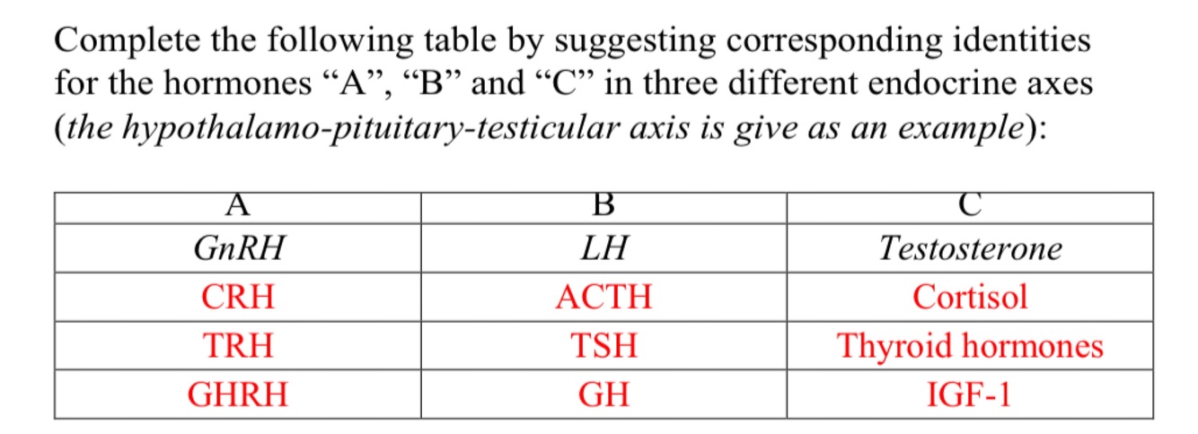 Complete the following table by suggesting corresponding identities for the hormones “A”, “B” and “C” in three different endocrine axes (the hypothalamo-pituitary-testicular axis is give as an example):