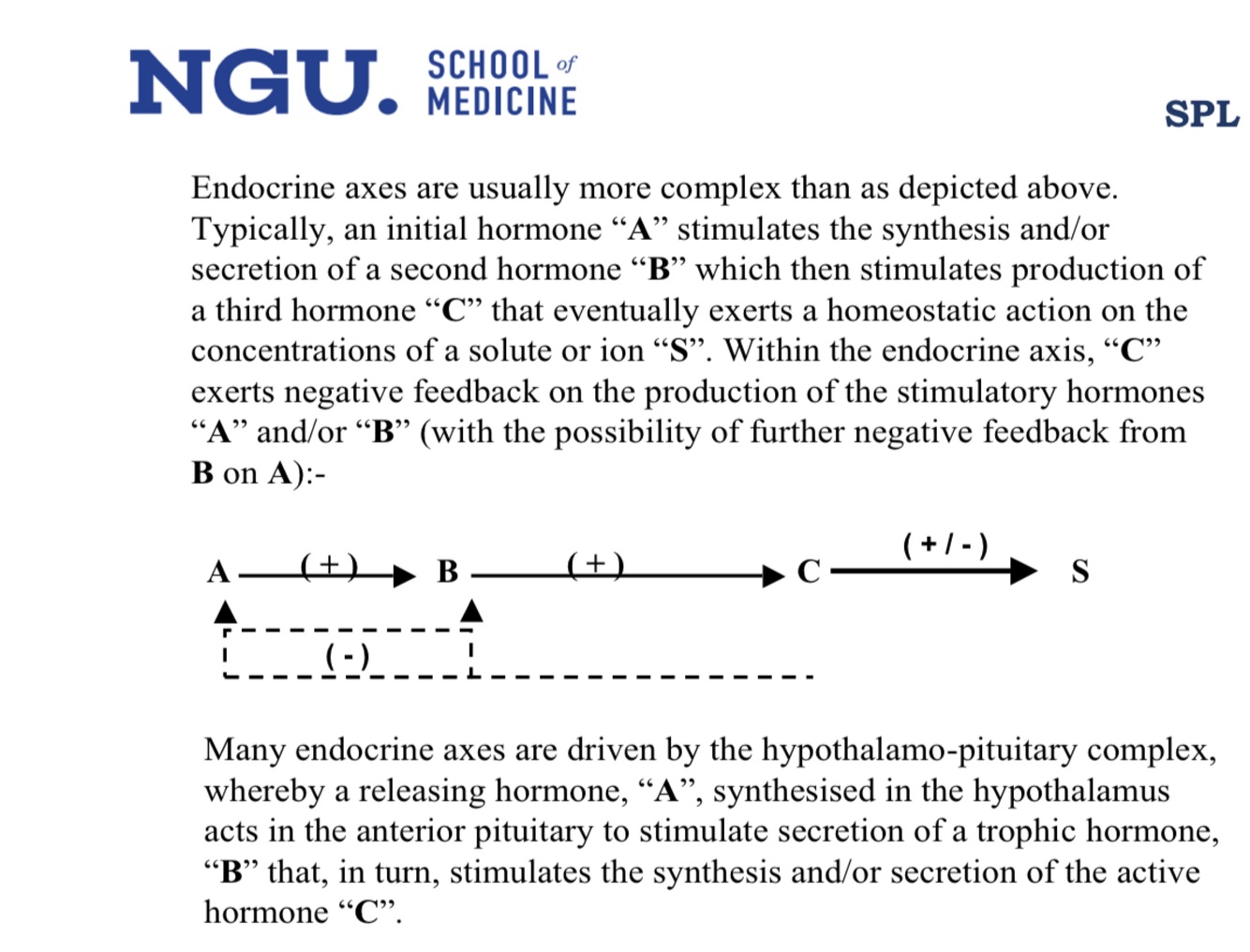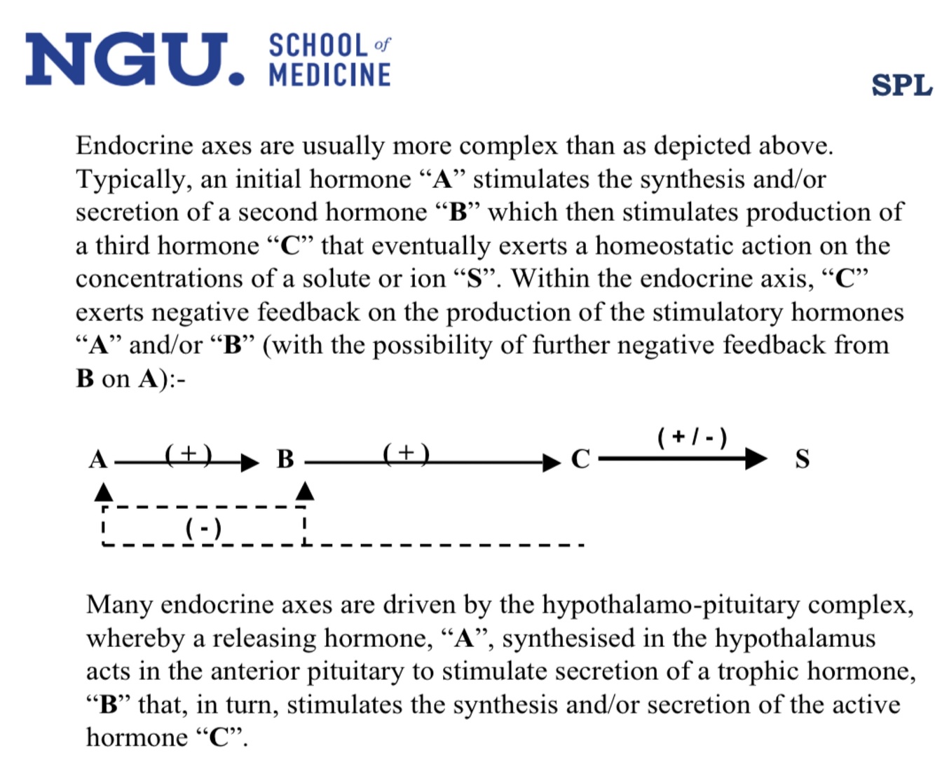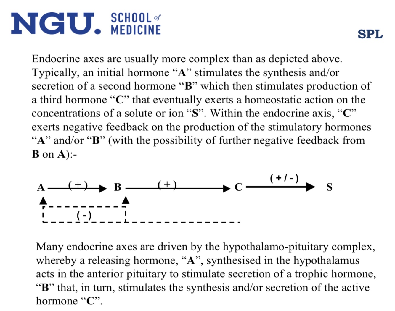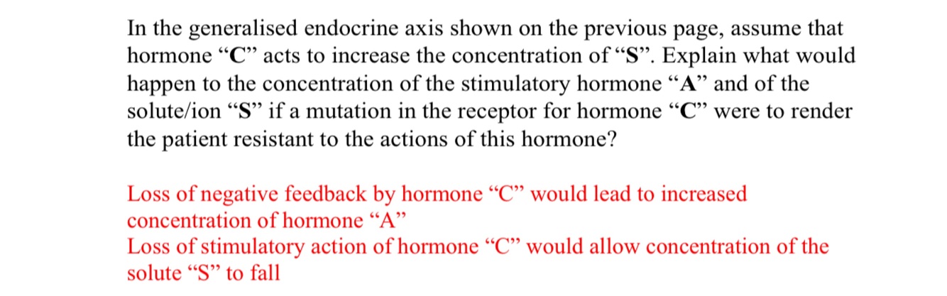 In the generalised endocrine axis shown on the previous page, assume that hormone “C” acts to increase the concentration of “S”. Explain what would happen to the concentration of the stimulatory hormone “A” and of the solute/ion “S” if a mutation in the receptor for hormone “C” were to render the patient resistant to the actions of this hormone?