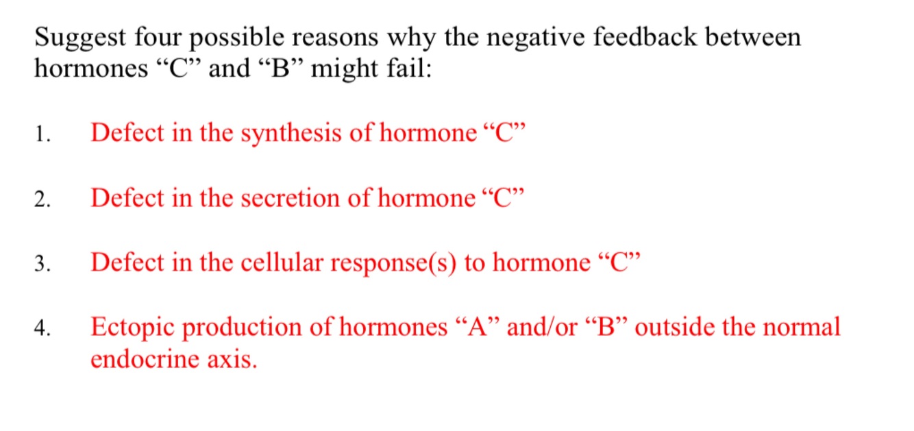 Suggest four possible reasons why the negative feedback between hormones “C” and “B” might fail: