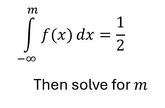 Set up an equation to find the median, m, of a continuous probability density function f(x)
