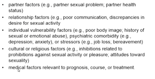 • Intrapsychic- beliefs, meanings, conflicts, guilt, shame, information distortion, past sexual trauma, depression/anxiety