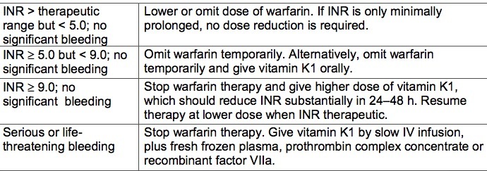 What is the recommended management of an elevated INR or bleeding in a patient receiving warfarin?