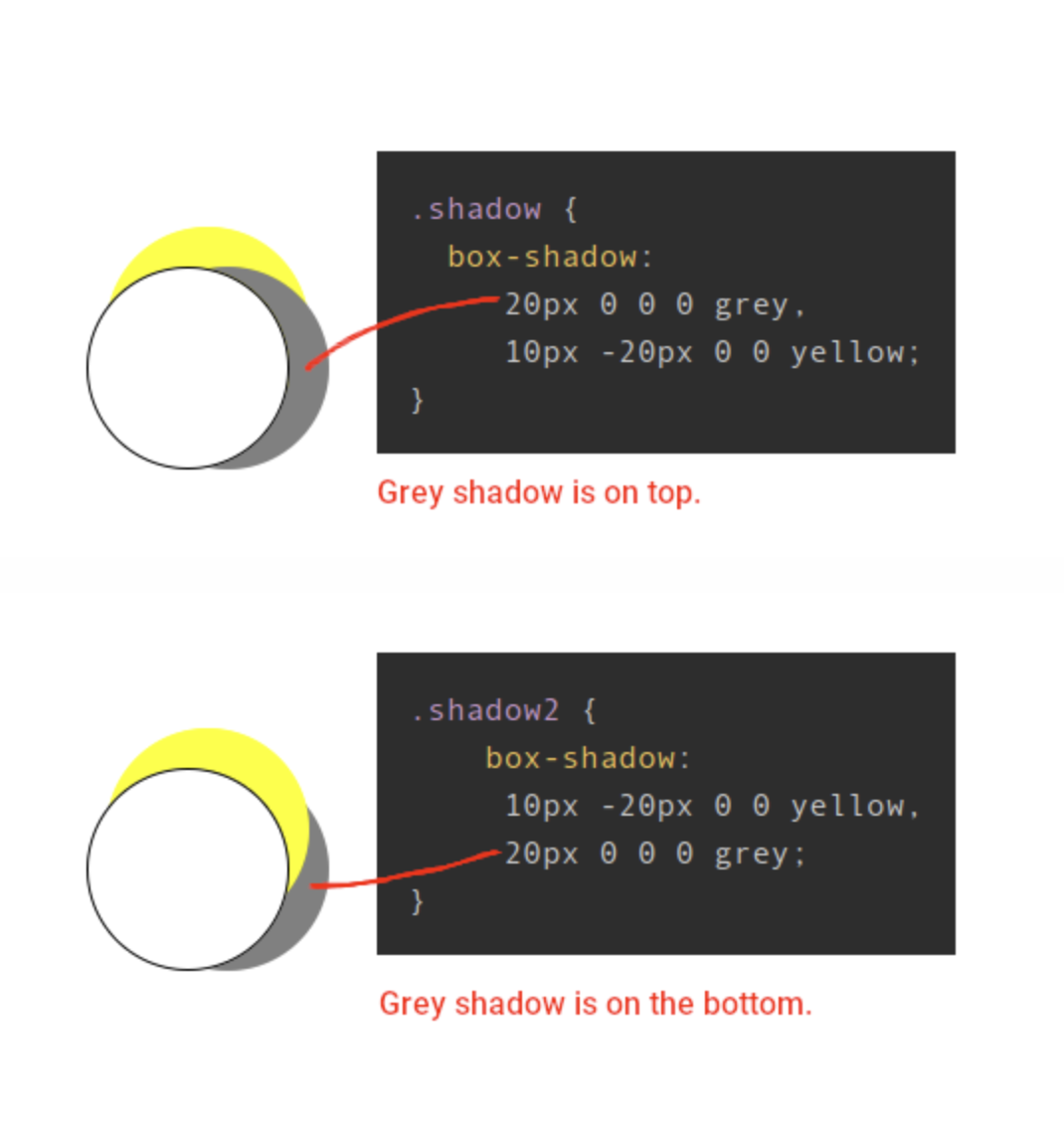 When more than one shadow is given, shadows are applied front-to-back, with the first-specified shadow on top.