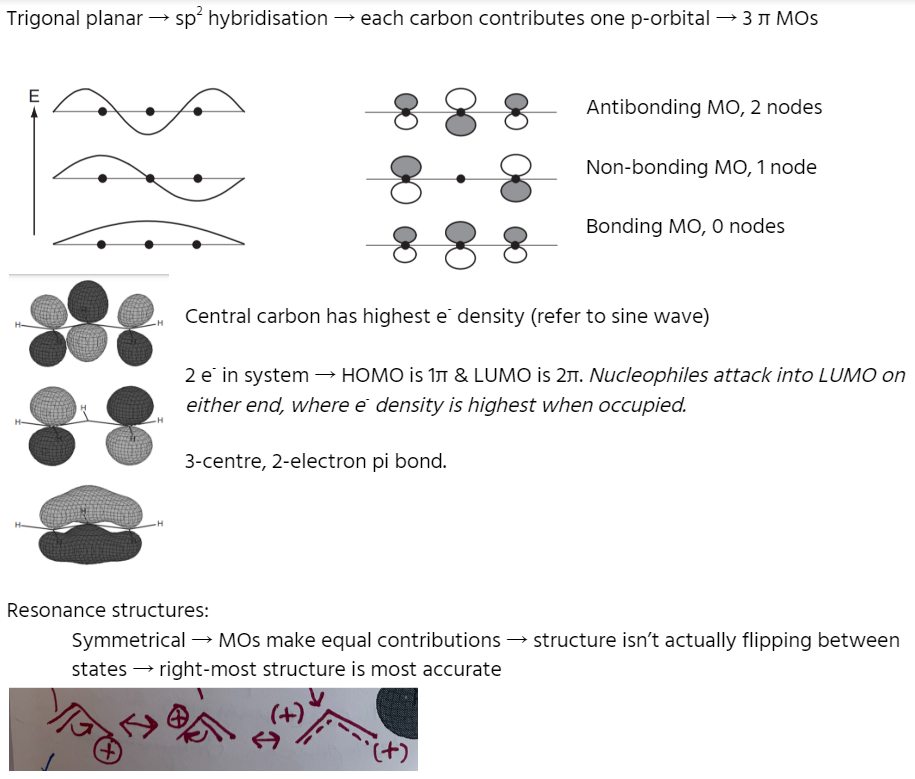 Using diagrams, describe the conjugated system and bonding in the allyl cation, H2C=CH-C+H2, and draw the resonance structures.
