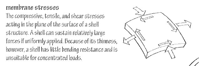 The compressive, tensile, and shear stresses acting in the plane of the surface of a shell structure. A shell can sustain relatively large forces if uniformly applied. Because of its thinness, however, a shell has little bending resistance and is unsuitable for concentrated loads.