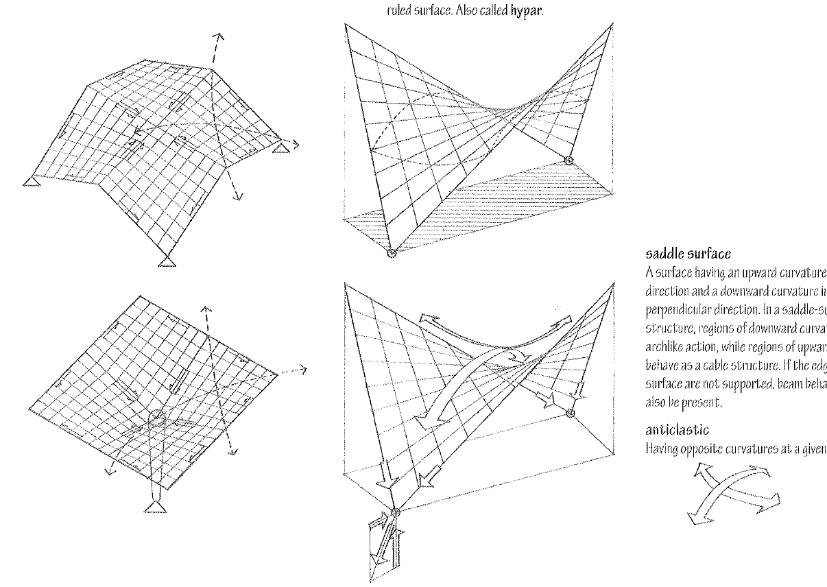 A surface having an upward curvature in one direction and a downward curvature in the perpendicular direction. In a saddle-surfaced shell structure, regions of downward curvature exhibit archlike action, while regions of upward curvature behave as a cable structure. If the edges of the surface are not supported, beam behavior may also be present.