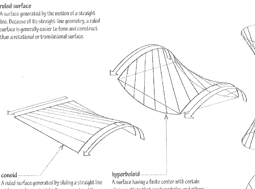 A surface generated by the motion of a straight line. Because of its straight-line geometry, a ruled surface is generally easier to form and construct than a rotational or translational surface,