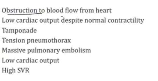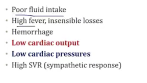 low pressures in the heart, high SVR and low CO