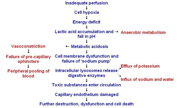 Inadequate prefusion = cell hypoxia = energy deficit = lactic acid accumulation and anaerobic metabolism & fall in pH