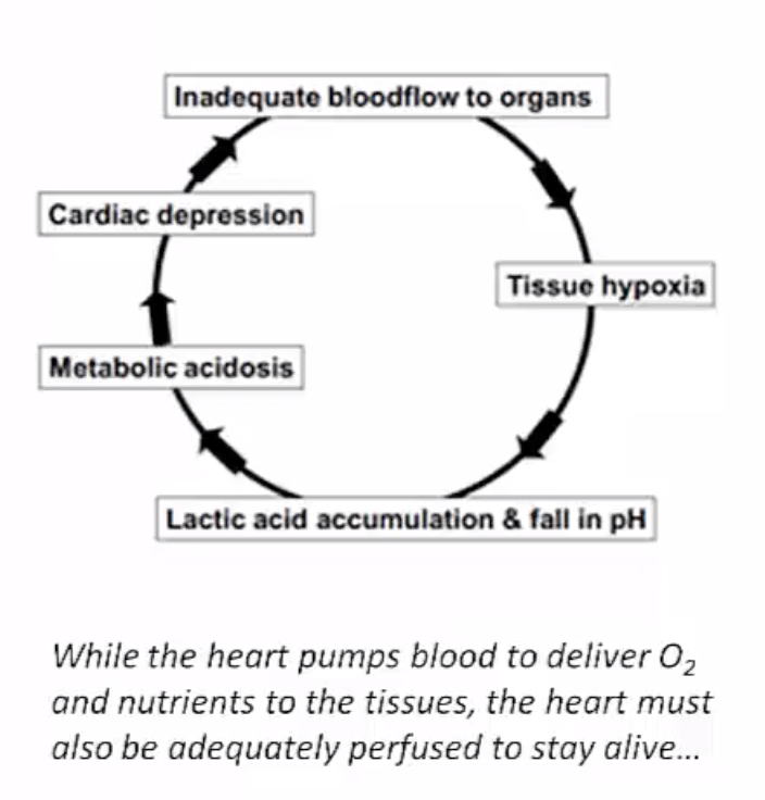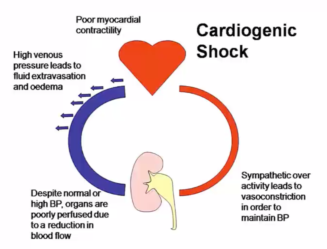 A 65 year old man with a history of hypertension was admitted with severe, sudden-onset chest pain. His physical examination showed sinus tachycardia, low systolic pressure, cool extremities, low urine output, and altered mental status. Blood test for cardiac enzymes and ECG findings were suggestive of an MI.