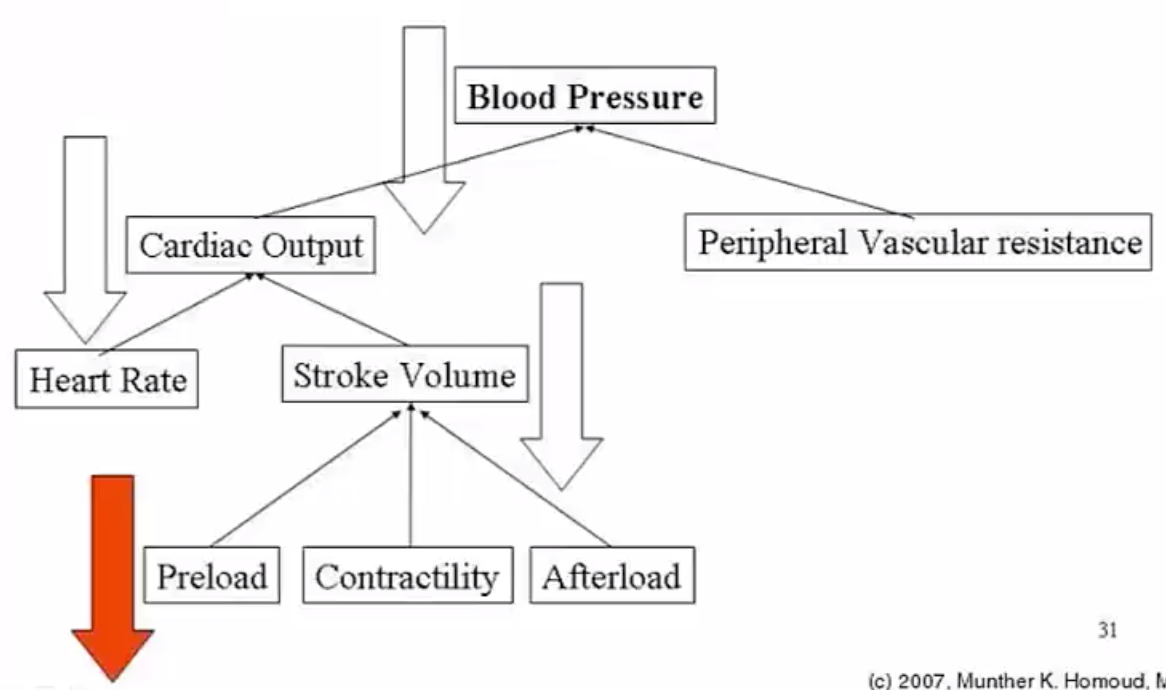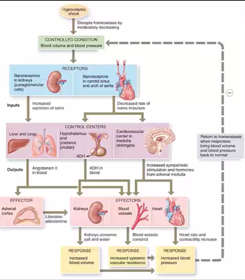 Describe the compensatory mechanisms for hypovolemic shock (flow chart)