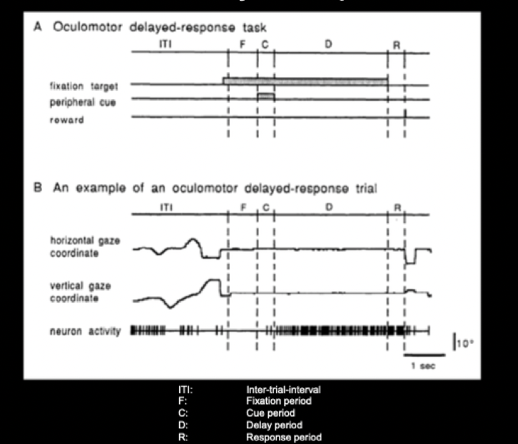 In the oculomotor delayed task, mostly non-human participants must fixate on a cross (F). After a presentation of a peripheral cue (C), they must remember the location of such peripheral cue, whilst maintaining their fixation on the cross. After a delay period (D) the participant must perform a saccade to the remembered location of the cue (C).