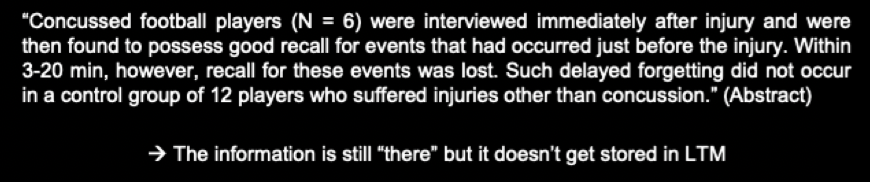 In a study with football players, that had a concussion it could be shown that they remembered details of the accident immediately after it happened but not 20 minutes later!