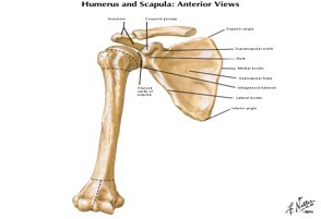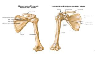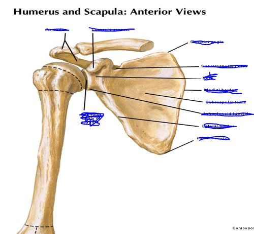 Anteriorly is the subscapular fossa and coracoid process. Posteriorly is the acromion projection, supraspinous fossa, infraspinous fossa, and glenoid supra and infraglenoid tubercles.