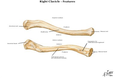 Acromial end which projects posteriorly, and sternal end which connects to the ribs. It is weakest between middle 2/3 and lateral third