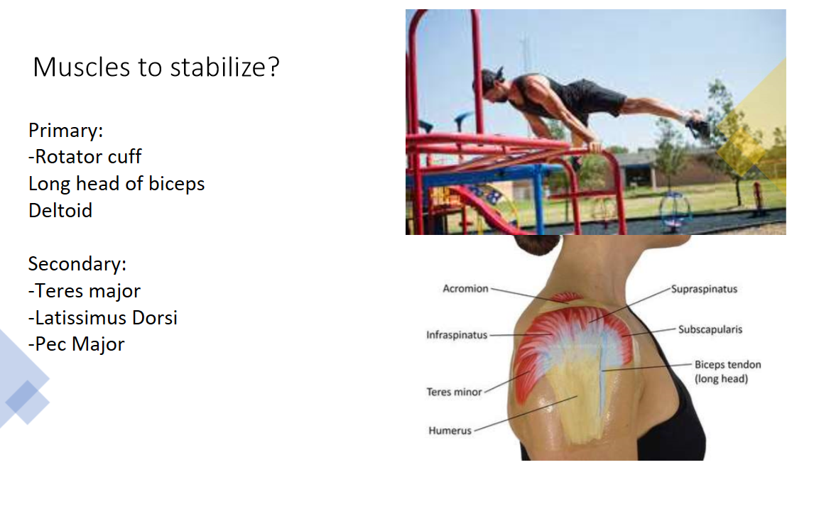 What muscles/structures provide primary and secondary stabilization to the shoulder