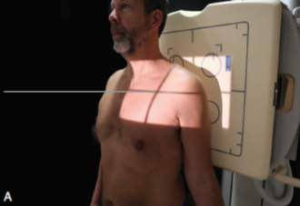 collimation should be 1.5 inches above shoulders and 1 inch beyond the lateral aspect of the shoulder, sternal end of the clavicle and the proximal third of the humerus