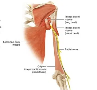 Radial nerve as it passes through radial groove then runs along lateral edge of humeral shaft