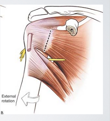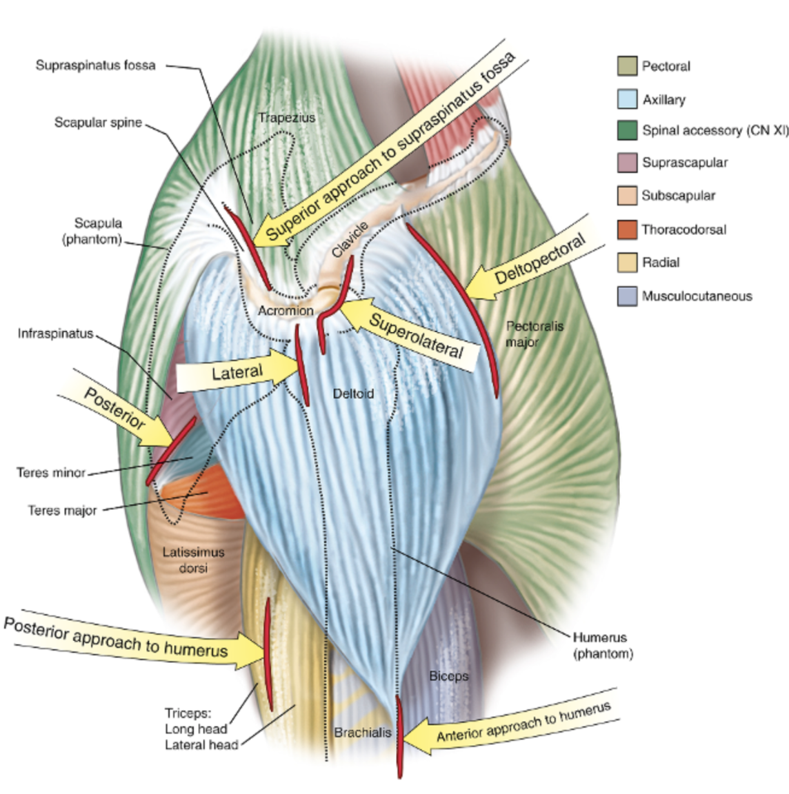 Dangers: axillary nerve and posterior circumflex artery in quadrangular space (teres minor/major), suprascapular nerve (around base of spine of scapula under infraspinatus