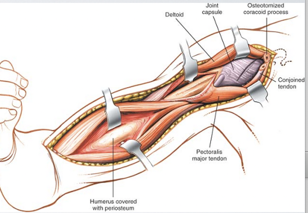 Dangers: musculocutaneous nerve under coracobrachialis, axillary nerve below subscapularis, brachial plexus and vessels medial to coracoid in the event of a major bleed - take down conjoint tendon completely to gain proximal control
