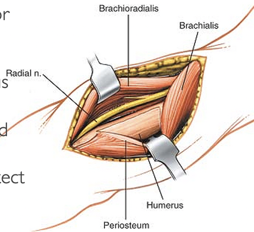 Incision: Extension of deltopectoral along lateral edge of biceps (stop ~5cm from elbow flexor crease) Interval: deltopectoral proximally, then biceps and brachialis (brachialis-splitting) Superficial dissection: deltopectoral approach proximally, then find plane between biceps and brachialis and retract biceps medially Deep dissection: proximally stay lateral to pec insertion, dissect subperiosteally to expose humerus; watch for anterior circumflex at proximal extent of pec insertion (ligate); may need to subperiosteally elevate pec insertion to fully expose Distally split brachialis (midline) to expose humerus Dangers: radial nerve in spiral groove (middle third) and between BR and brachialis distally; axillary nerve proximally; anterior humeral circumflex artery (as above)