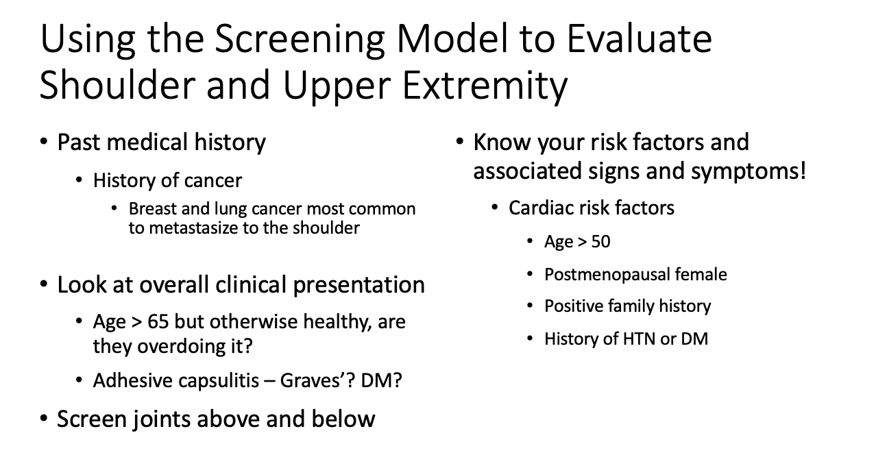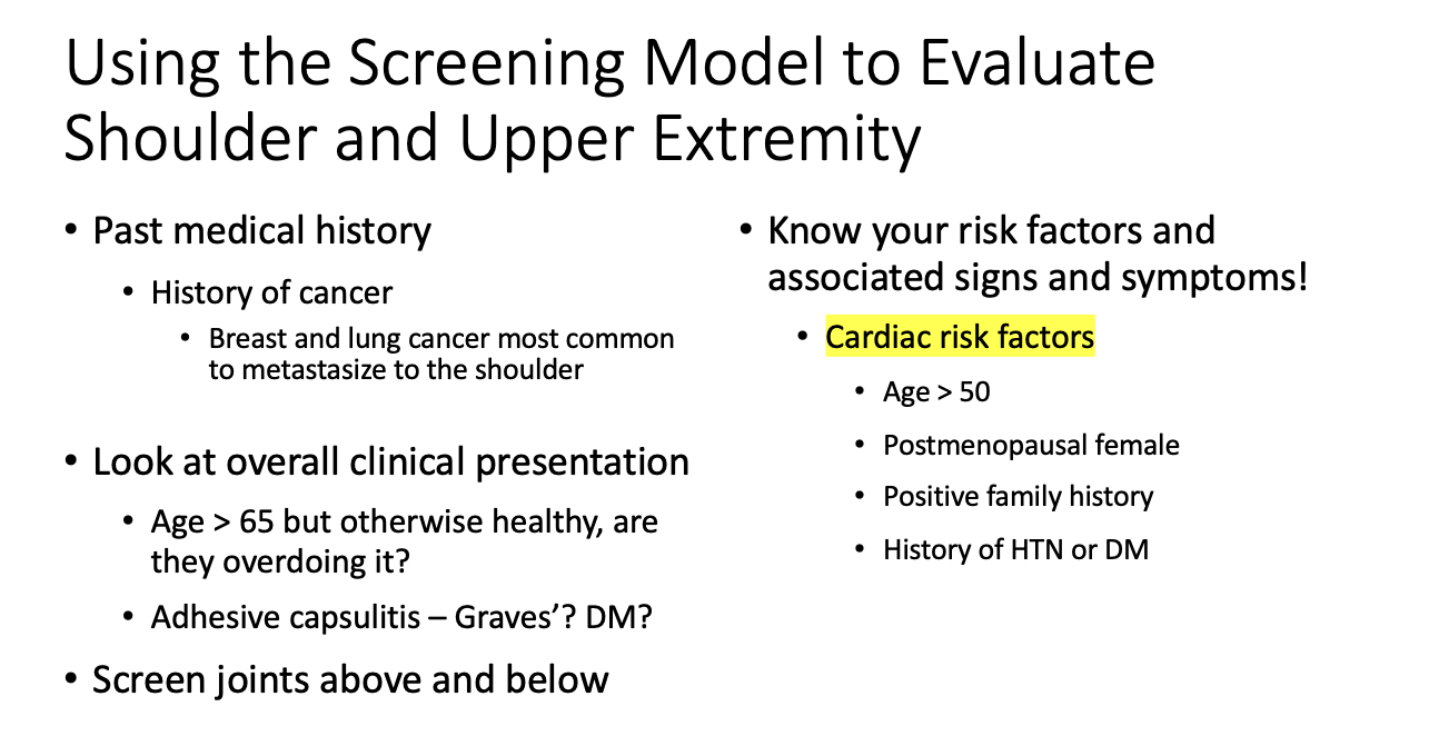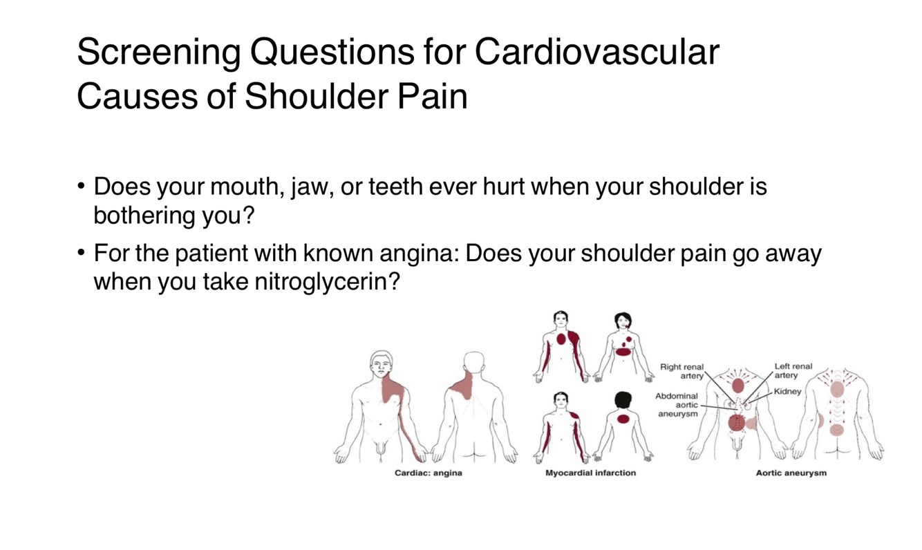 What screening questions should you ask to rule out cardiovascular causes of shoulder pain?