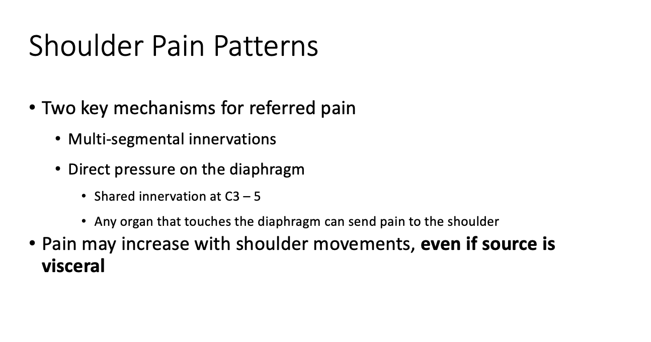 Describe how shoulder pain can be differentiated as being of visceral origin rather than musculoskeletal.