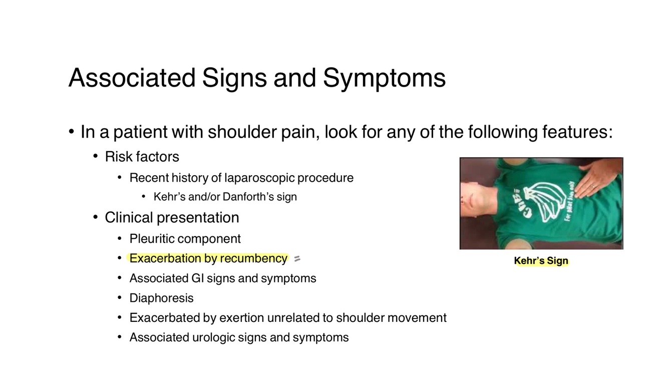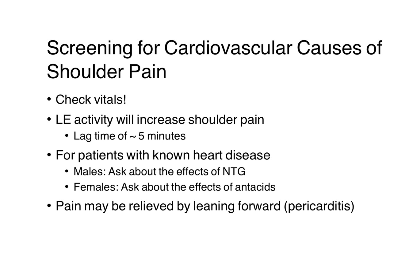 “Does your shoulder pain decrease when you take nitroglycerin or lean forward?”